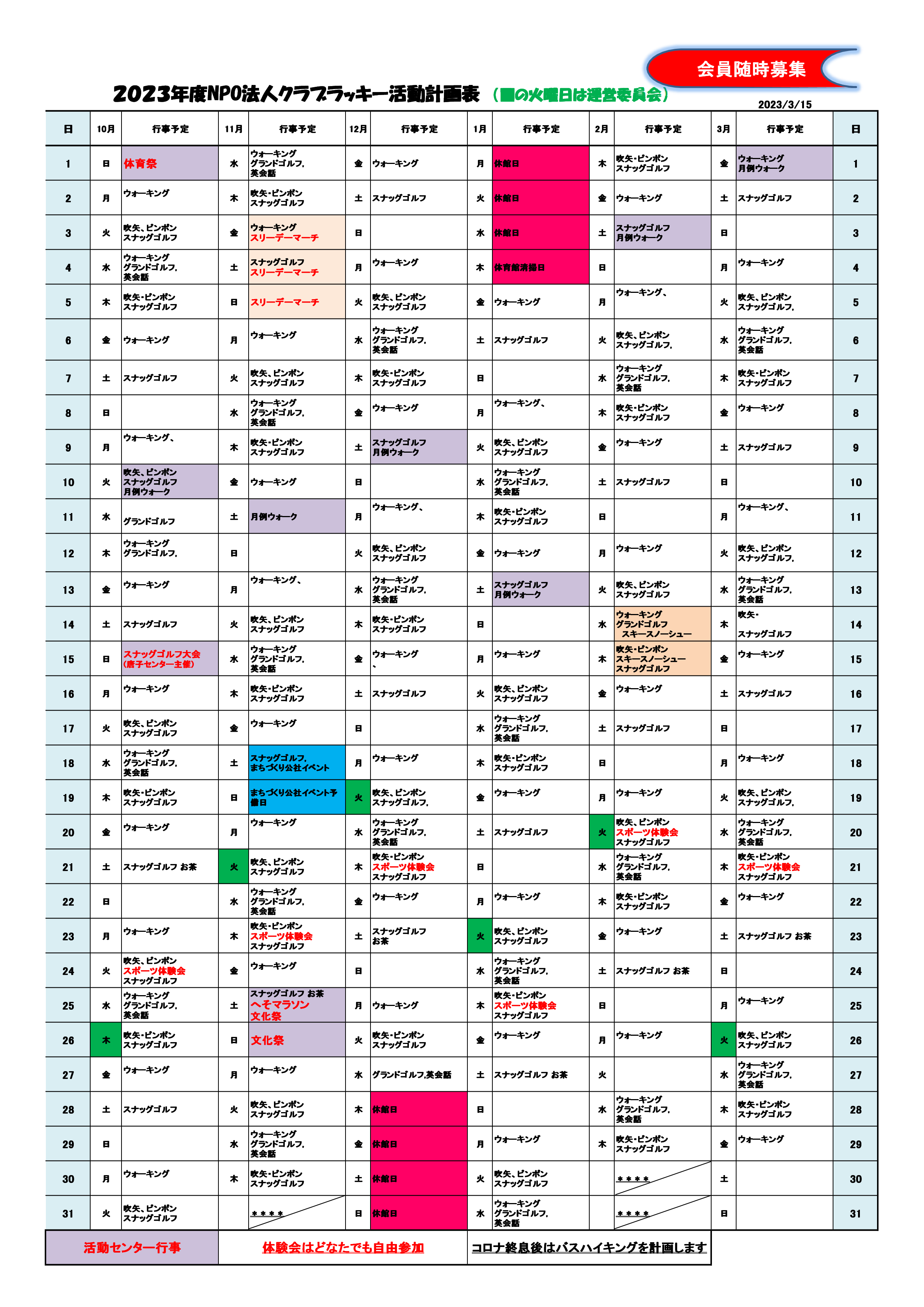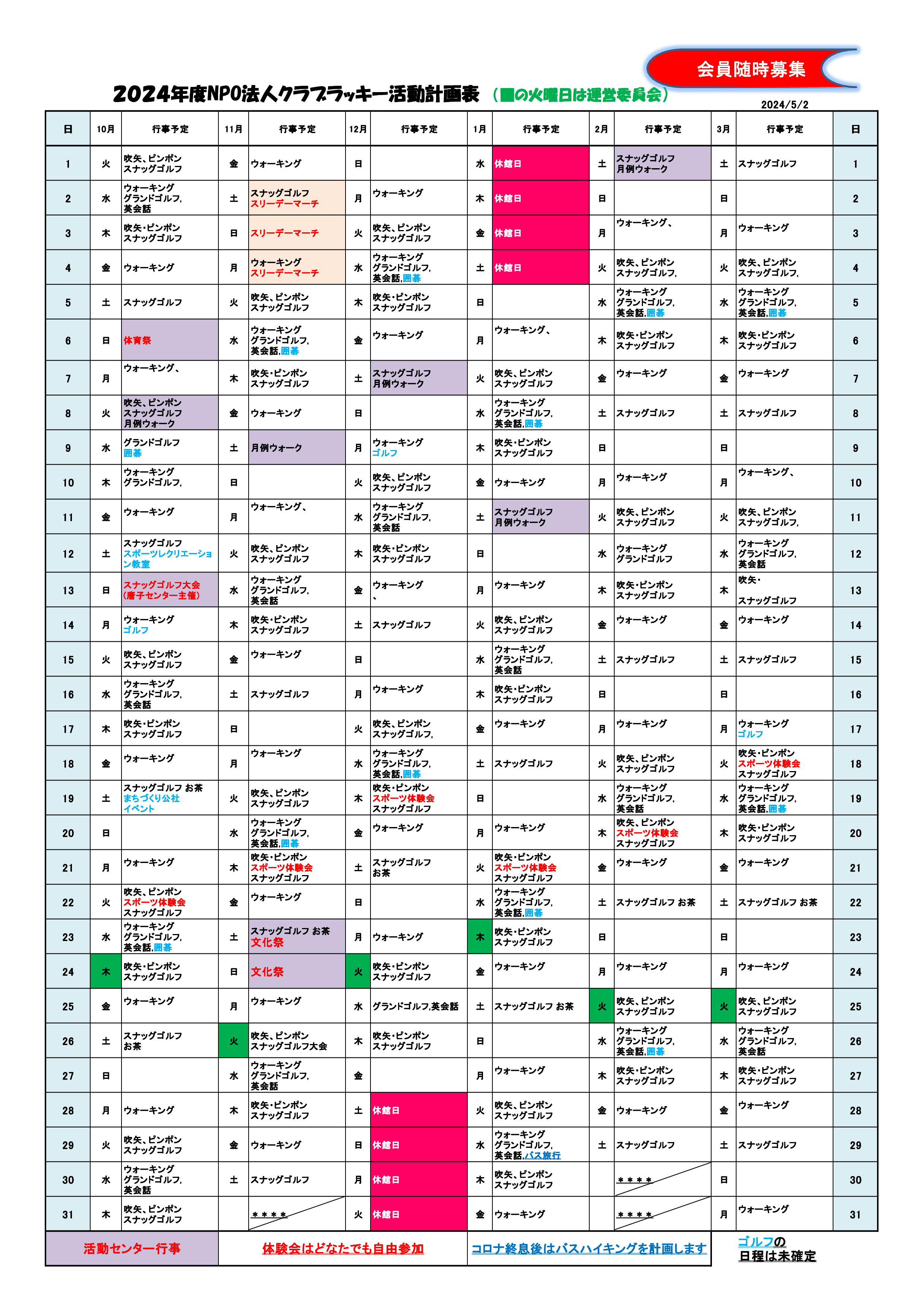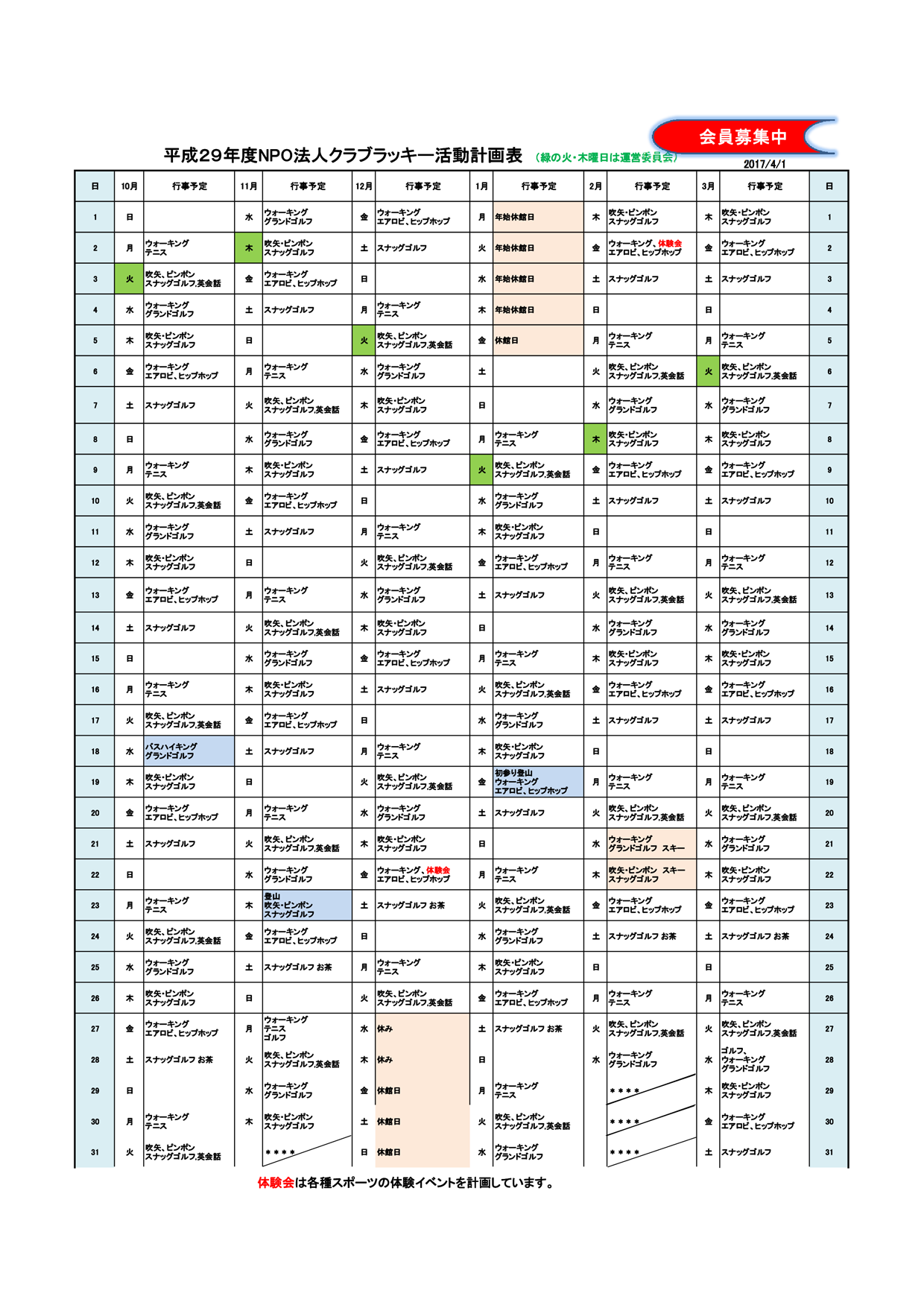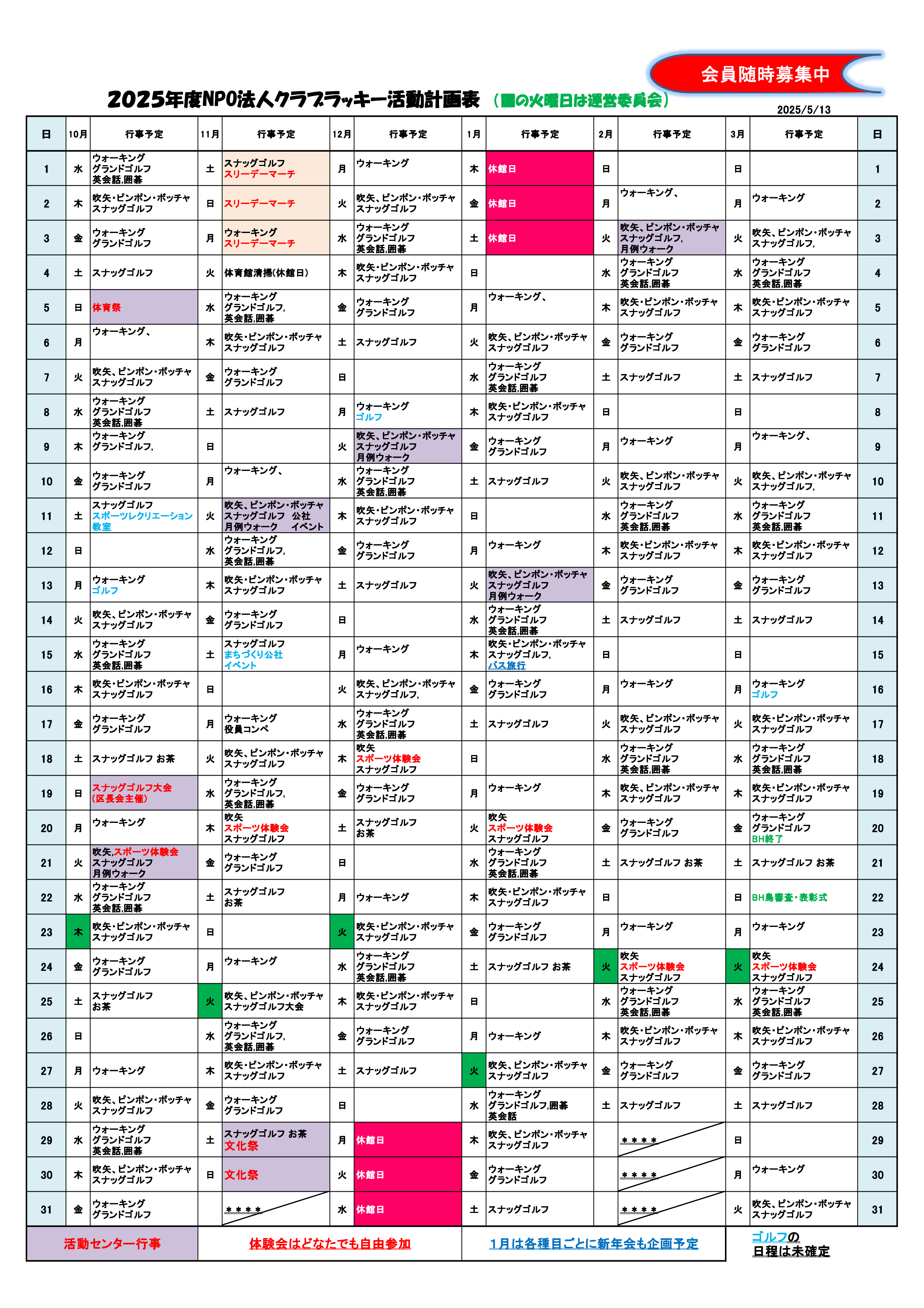 クラブラッキー年間予定表