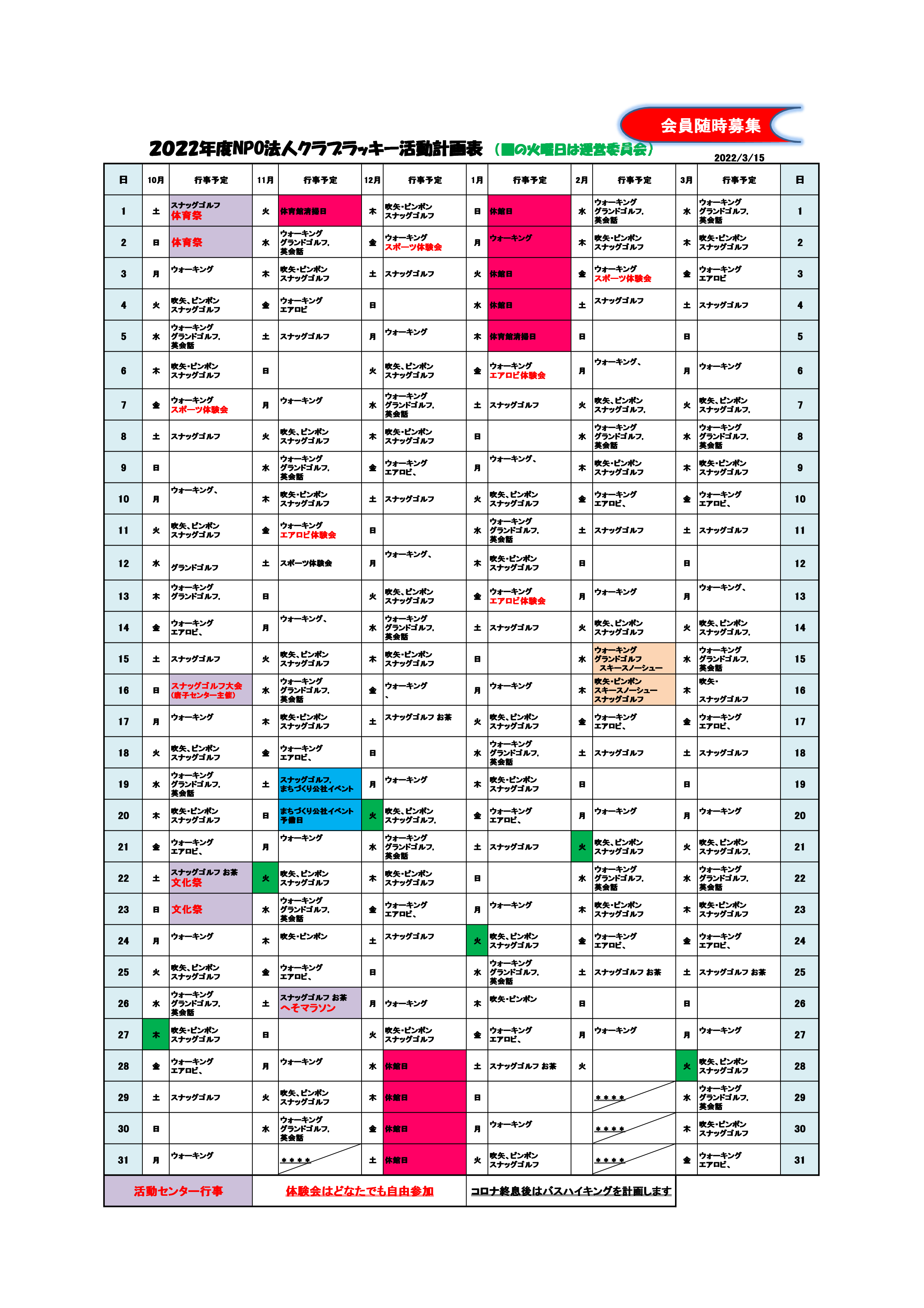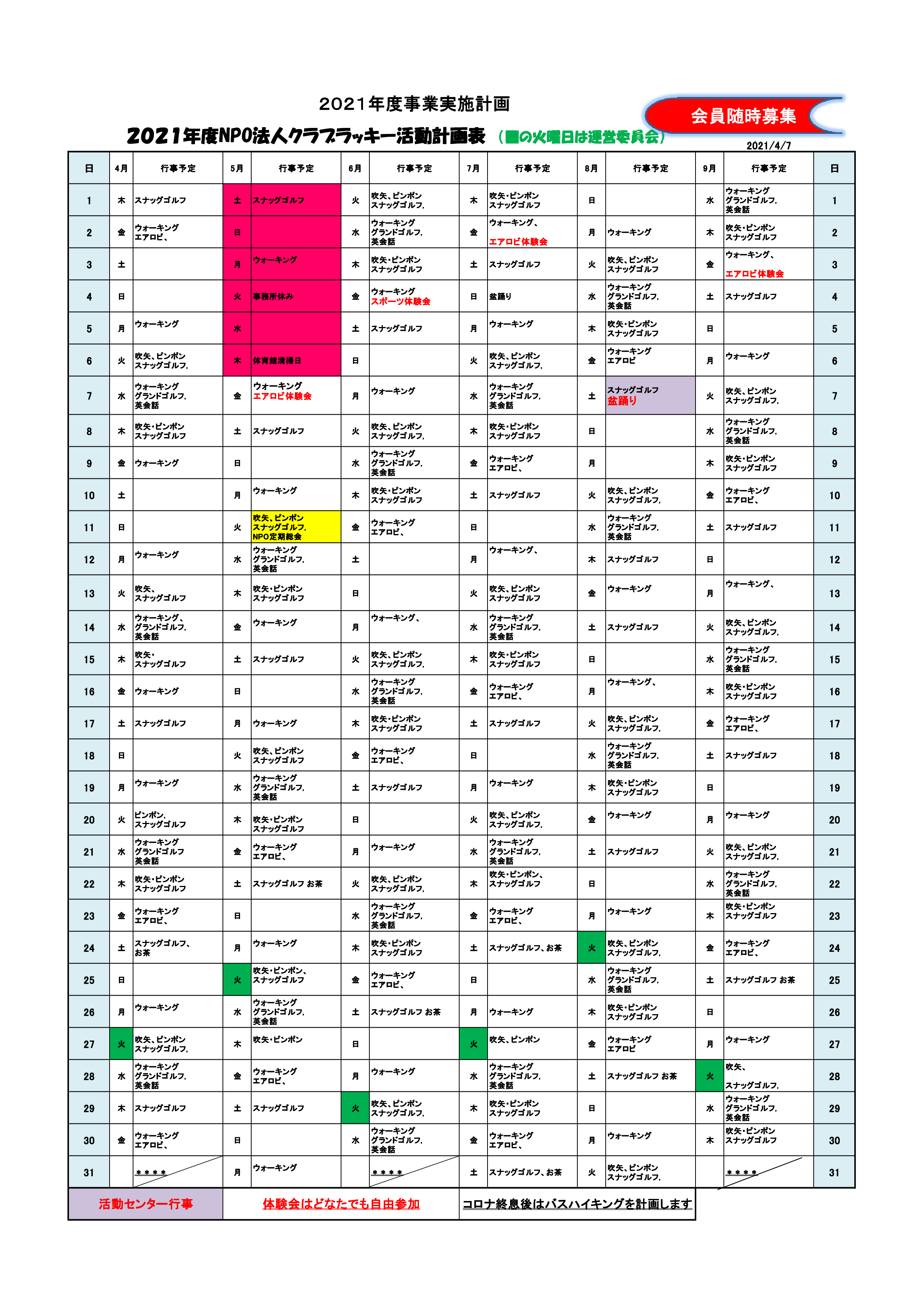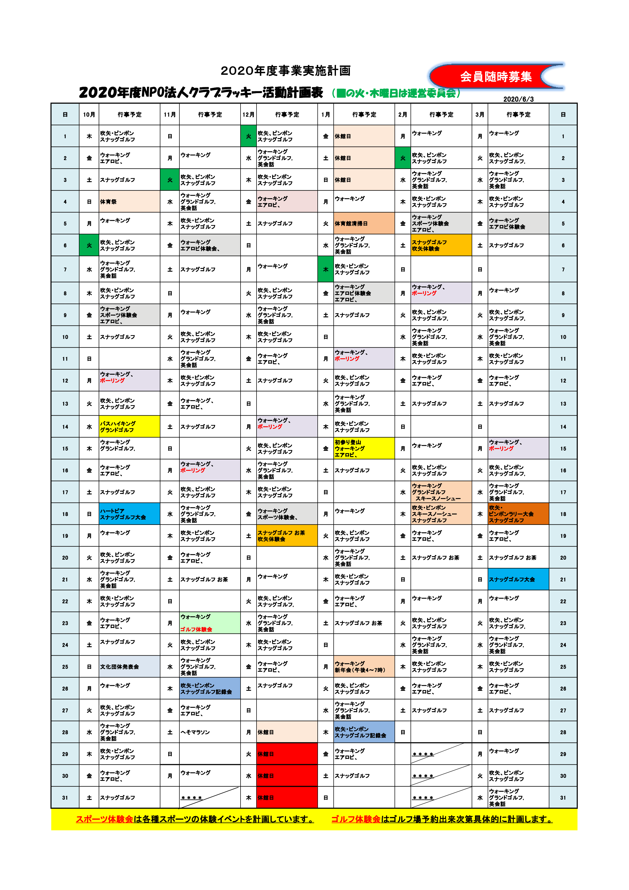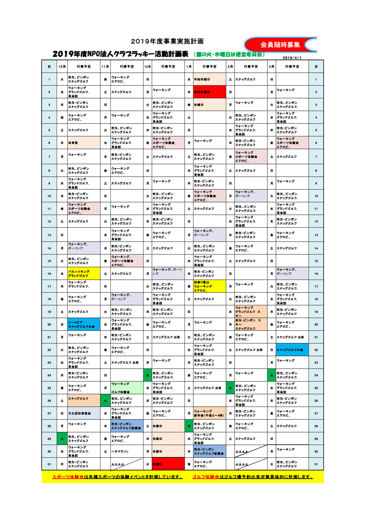 クラブラッキー年間予定表
