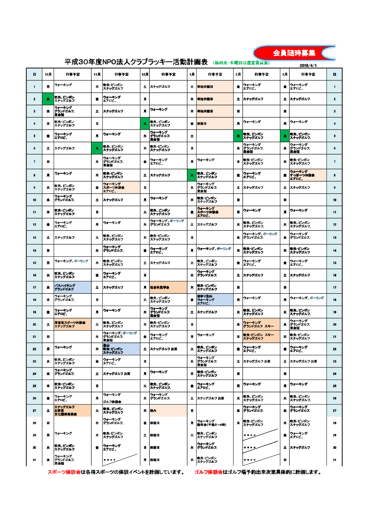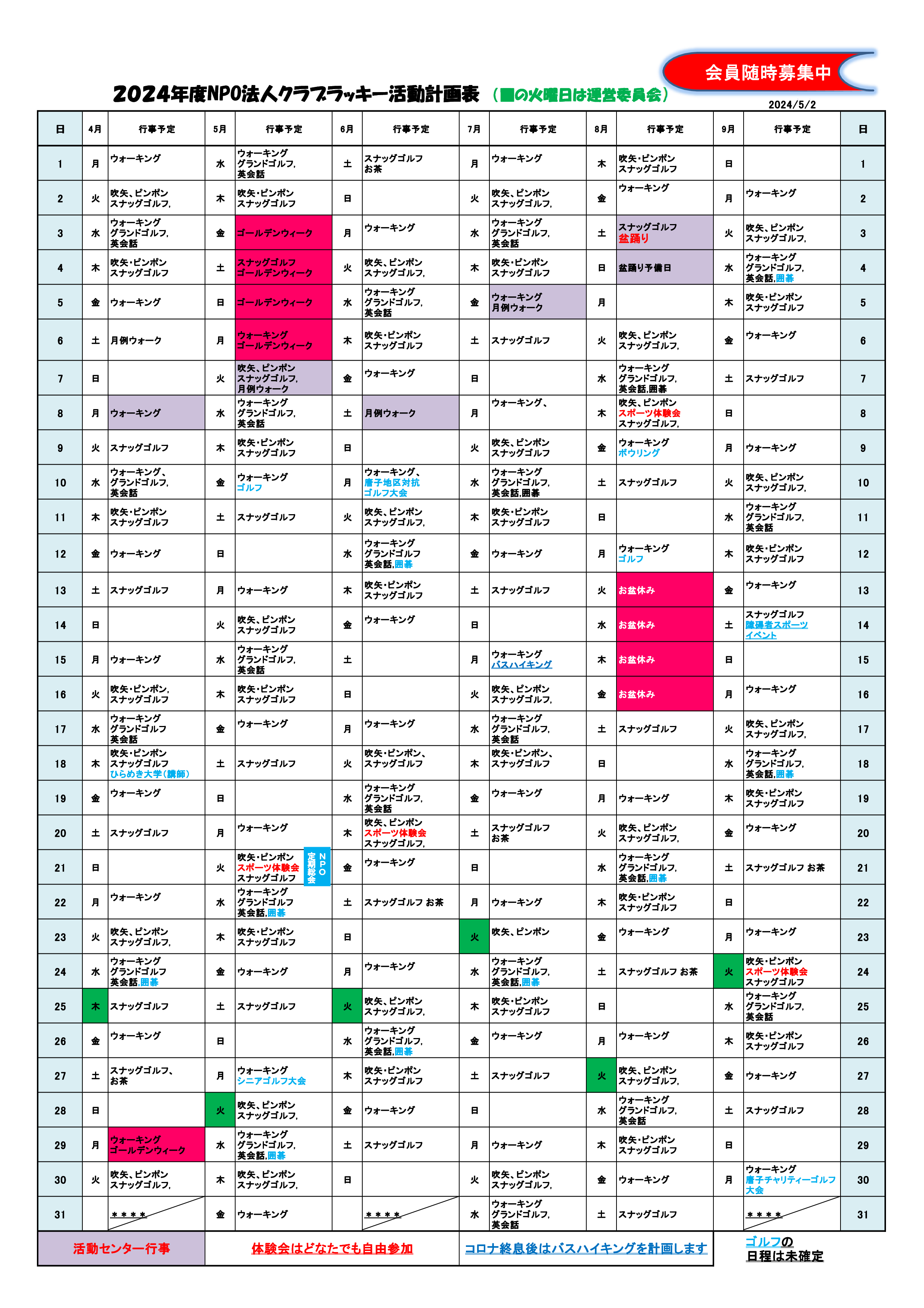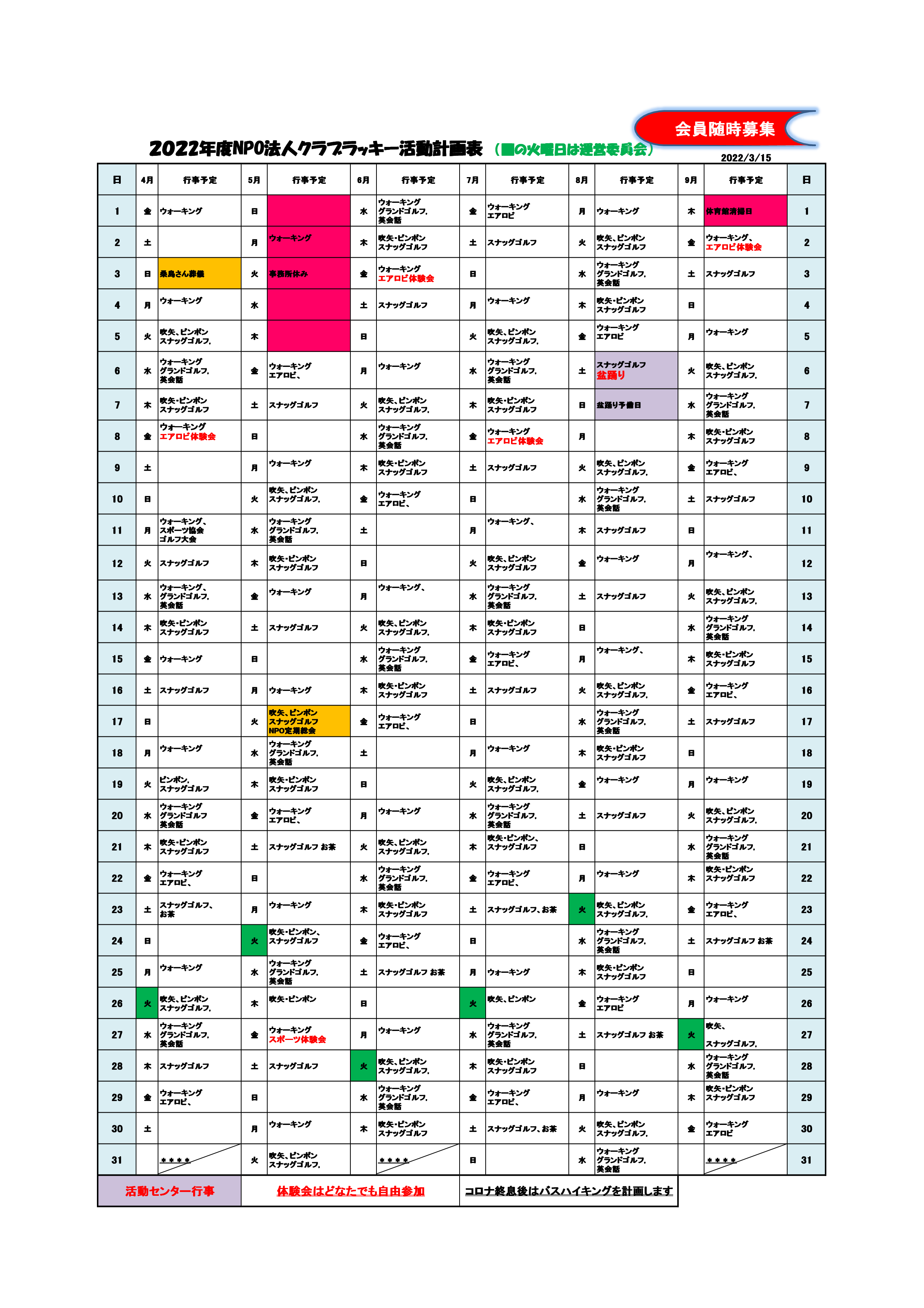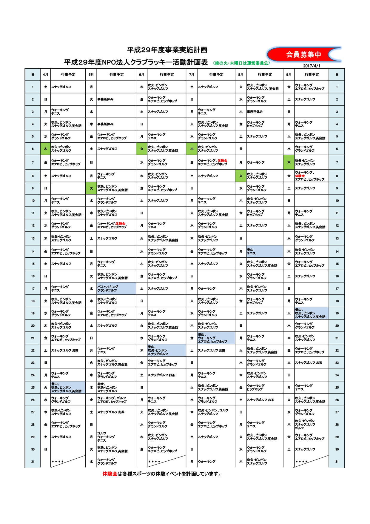 クラブラッキー年間予定表