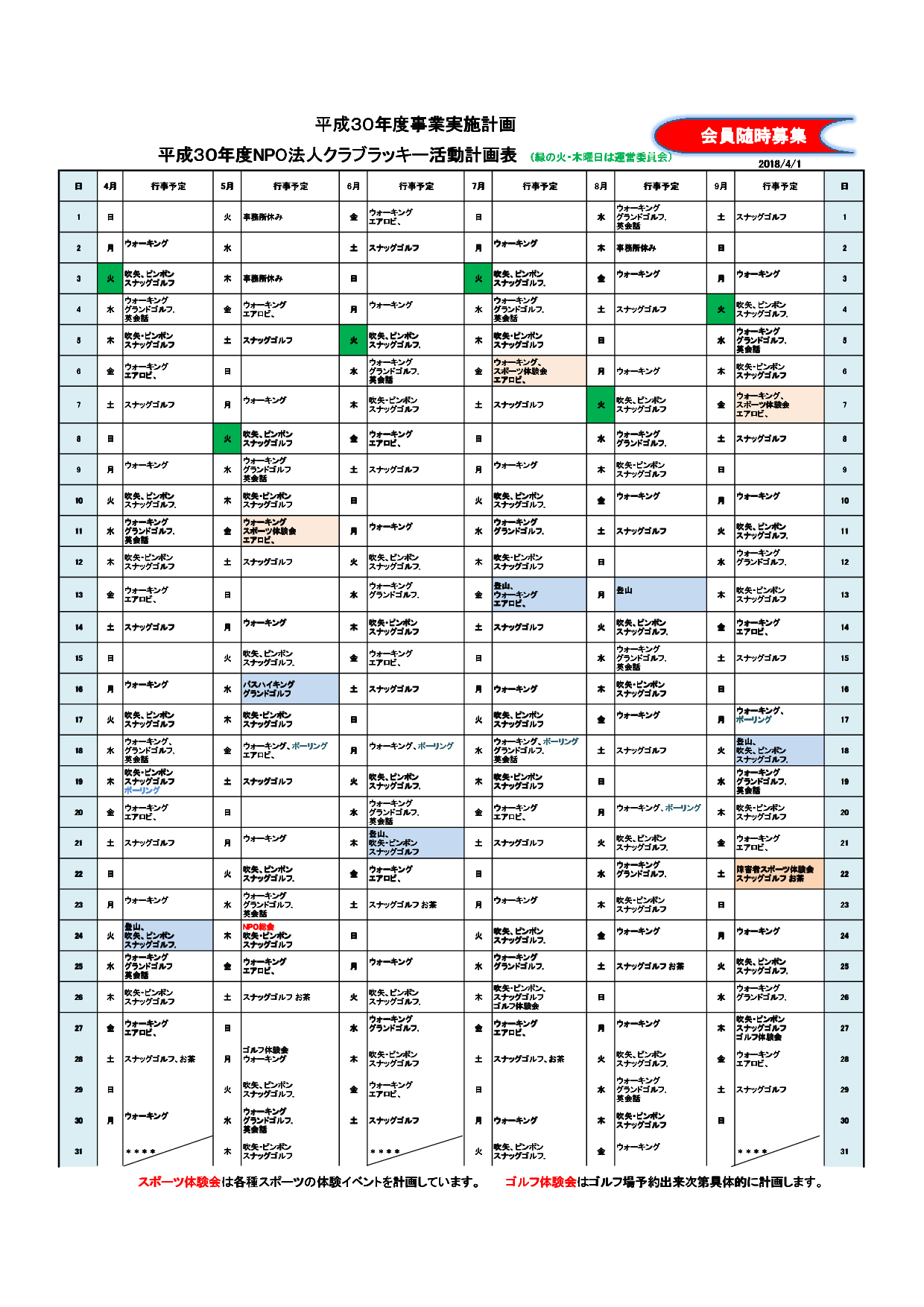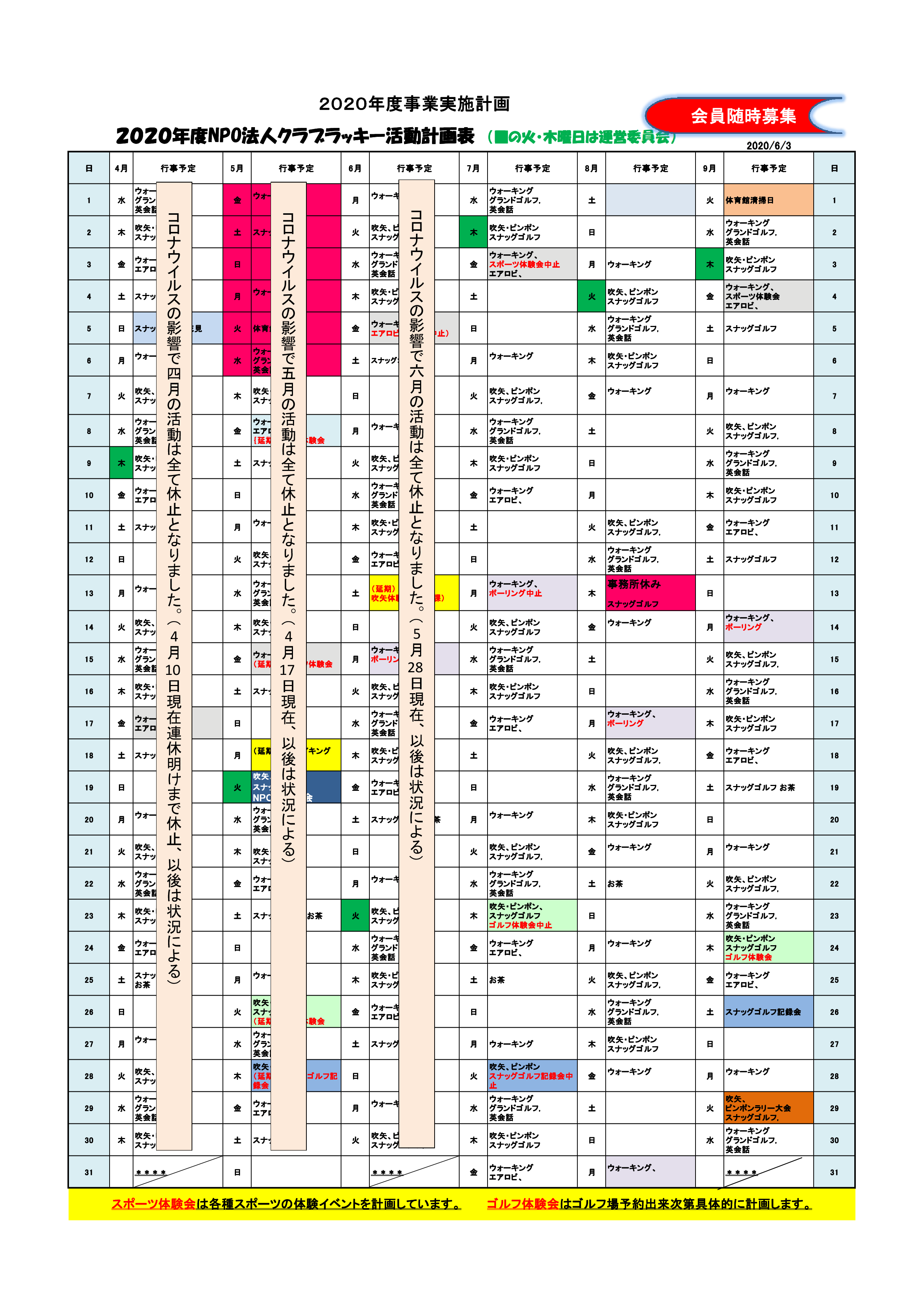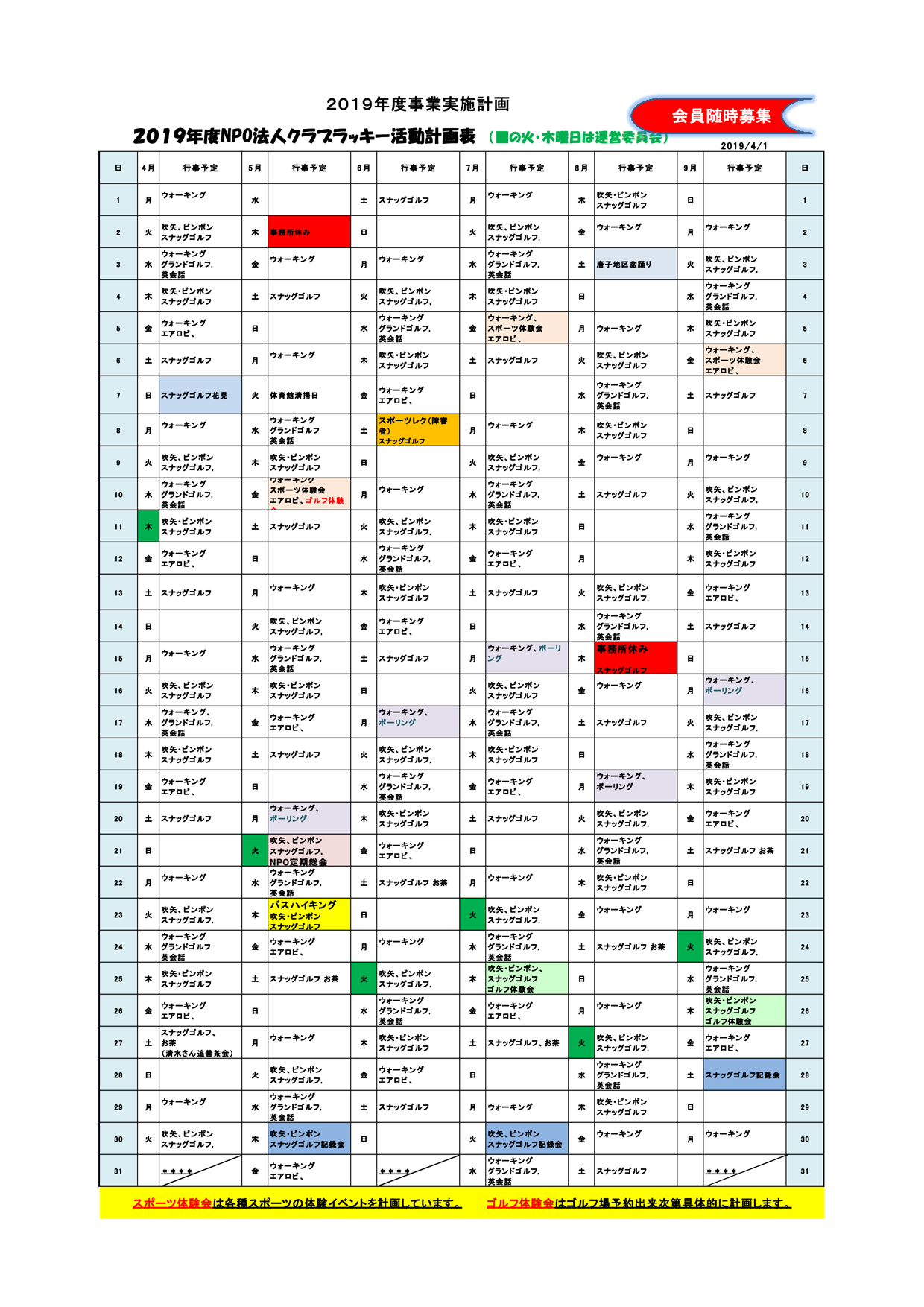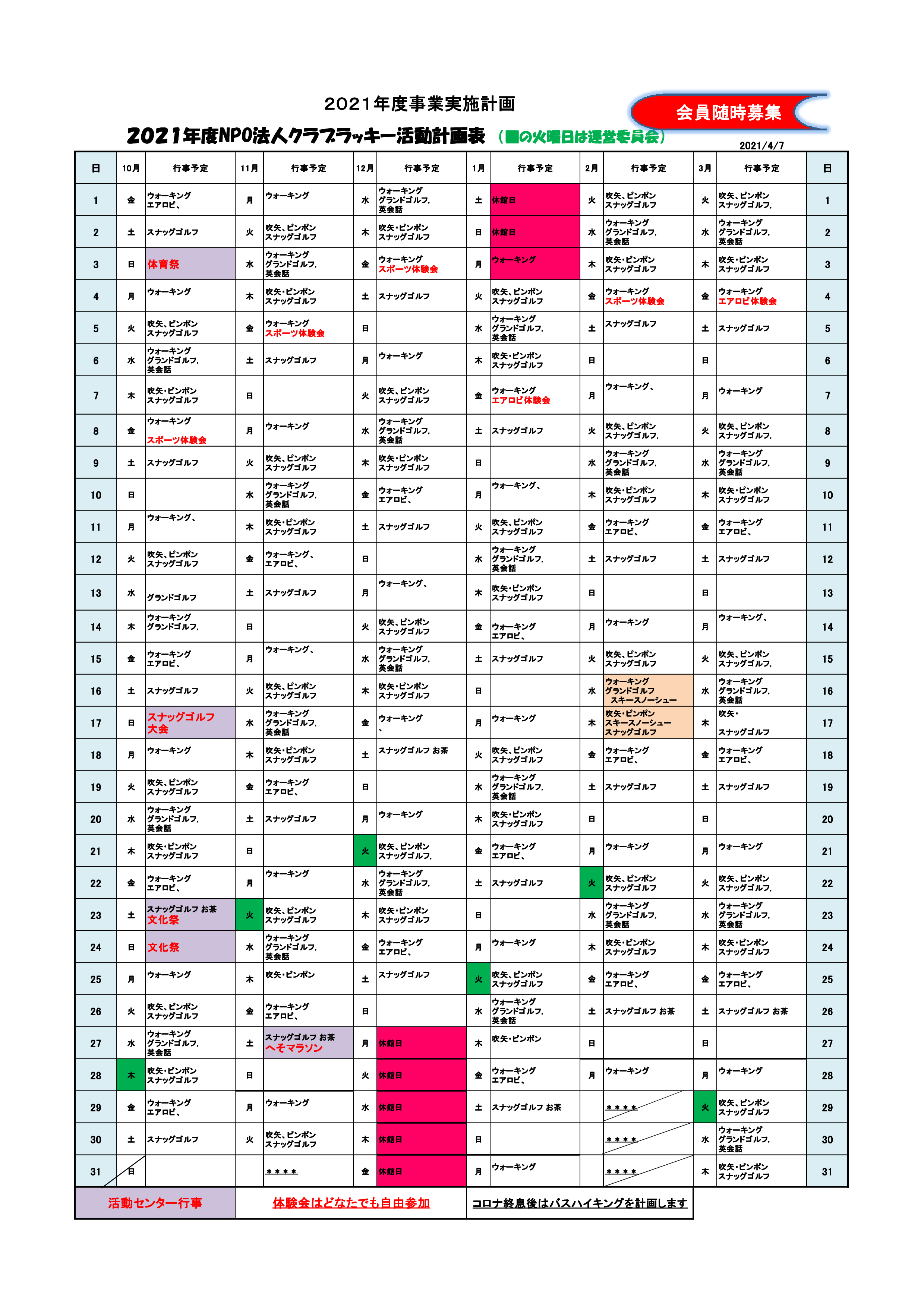 クラブラッキー年間予定表